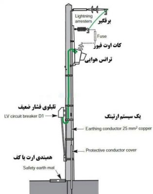 - بالای پایانه نور باید حداقل ۲ متر بر روی ناحیه ای که از آن محافظت می کند (شامل آنتن ها، برج های سردخانه، سقف ها و مخازن) نصب شود.